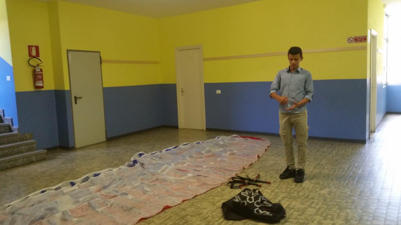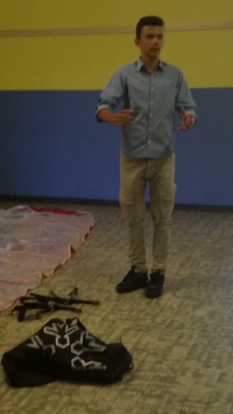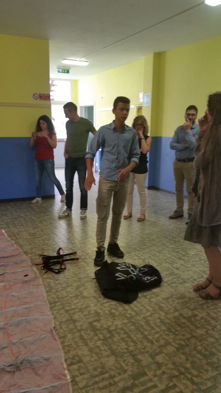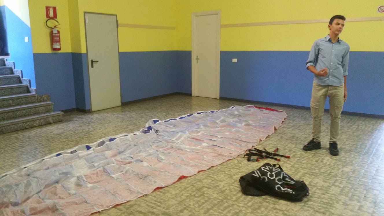 Poiché per il collegamento con tecnologia ho scelto come argomento “Il parapendio”, ho deciso di portare a scuola un vero e proprio parapendio che ho aperto nel corridoio del primo piano.