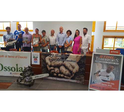 la Sagra della Patata, quella di agosto sarà quindi un'edizione “d'argento”. Una Sagra, la regina tra le ossolane, che cambia e che si rinnova in bellezza e novità, ogni anno, un' Eco-Festa attenta al territorio, ai suoi prodotti di qualità a km zero, alla bioagricoltura e al riciclo dei rifiuti, per celebrare questo prezioso traguardo un'edizione speciale con eventi importanti, come è stato spiegato ieri nelal sede della Provincia a Verbania, alla presenza del presidente della Pro Loco e del Comitato Sagra Guido Tomà, dei vari membri del comitato e del sindaco Silvia Miguidi: “Sabato 25 dalle ore 20 e domenica 26 agosto dalle ore 19, la Sagra ospiterà con grande orgoglio i1 Campionato italiano dello sport del taglio del legno Stihltimbersports, un evento prestigioso che Stifil ha permesso di portare a Montecrestese. Si tratta di uno sport estremo in cui gli atleti si sfidano a colpi d'ascia e motosega su sei differenti prove, i cui nomi derivano dalla tradizione anglosassone dove questo sport è nato nel XIX secolo: Springboard. Stock Saw, St2ncling Block Chop, Single Buck, Underhand Chop e Hot Saw, uno sport spettacolare che unisce, forza e potenza, precisione, tecnica e adrenalina. Il legno utilizzato in gara viene coltivato, tagliato per standardizzare i diametri, nel rispetto dell'ambiente. Tutto il materiale scartato viene poi riutilizzato. Stihlotimbersports si é affermato come l'eccellenza tra gli sport dei taglia legna, con i migliori atleti e le maggiori platee.