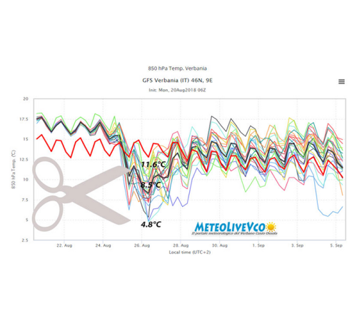 Ma rimane ancora molta incertezza sull’effettiva portata della sventagliata fresca. Infatti, come puoi vedere dal’immagine sopra, c’è una forbice molto aperta, questo significa che tra l’ipotesi più fresca, 4.8°C a circa 1500 metri, e quella più calda 11.6°C, i modelli devono ancora allinearsi. Solitamente in questi casi sarà una via di mezzo e l’aria fresca in entrata sarà di circa 8.5°C. In questo caso avremo, in meno di 24 ore, un calo reale delle temperature di 9/10°C.”