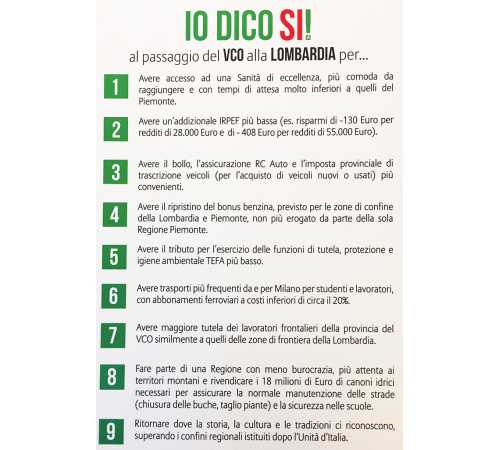 DOMODOSSOLA- 24-08-2018- Presentazione ufficiale da parte dei promotori del referendum per il ritorno del Vco in Lombardia del manifesto e dei nove punti principali a sostegno della tesi. Walter Zanetta e Luigi Spadone, poi supportati dall'ex onorevole e sindaco di Verbania Marco Zacchera, hanno presentato il manifesto ed i punti, rimandando ad una serie di conferenze che sviscereranno, punto per punto, i vantaggi del passaggio alla Lombardia con l'ausilio di tecnici ed esperti: “ Raggiungere il quorum sarà abbastanza complicato- è stato spiegato da Valter Zanetta - ma se cresce il movimento allora ce la possiamo fare, credo che possiamo farcela. Vediamo una grande risposta dei cittadini e lo scetticismo degli amministratori che vedono questa cosa come legata alle nostre persone. Crediamo che se la politica debba alzarsi, può usare la costituzione per una cosa come questa, e non deve perdere l'occasione, perchè con questo referendum ci giochiamo anche il futuro del Vco. Diffonderemo i nove punti in tutto il territorio attraverso serate a tema con esperti. Useremo strumenti di convincimento uno ad uno, useremo la politica del passato per dialogare, ma useremo anche gli strumenti nuovi”. A tal proposito Luigi Spadone ha spiegato: “Su Facebook stanno cominciando la campagna mediatica contraria a questa iniziativa, alcune sono critiche costruttive e spunti di riflessione, altre sono tutte balle, come il trasporto dei disabili che viaggiano gratis in Piemonte. E' vero che in Lombardia con 10 euro all’anno possono viaggiare gratis anche sugli intercity. Questo è un esempio di fake news. Anche il fatto che non avremmo nessun eletto in Lombardia nel consiglio regionale e una fake news, è vero il contrario... perché in Piemonte è quasi impossibile a meno di risultati clamorosi, in Lombardia invece viene garantito ad esempio che la Provincia di Sondrio abbia un posto in consiglio regionale per il più votato della maggioranza. Qualunque essa sia. Quindi garantisce la presenza della stanza dei bottoni, e la garantisce anche se la Provincia di Sondrio avesse un altro colore politico. Anche questa è stata usata come fake news. Insomma, se contassimo come Sondrio staremmo molto meglio. La Lombardia ci tratterà come meritiamo, non come ha fatto Torino, che ci considera fuori dal mondo”.