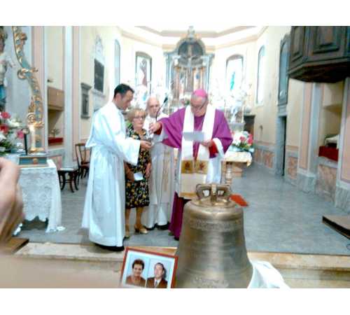 La conclusione della cerimonia ha visto la benedizione da parte del Vescovo Brambilla della campana, donata alla chiesa in memoria dei suoi genitori dalla signora Anna Foscaletti, originaria di Viganella, che con le altre quattro già presenti sul campanile della chiesa, consentirà finalmente di effettuare concerti campanari.