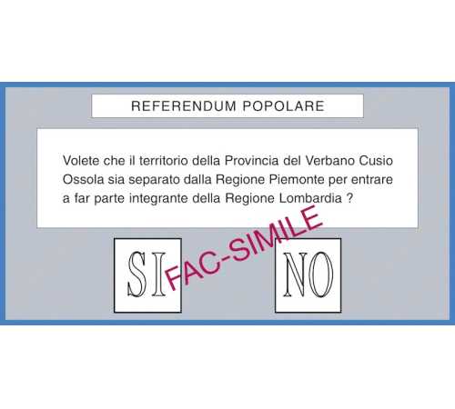 VCO - 16-10-2018 - Mancano ormai pochi giorni al referendum consultivo per il passaggio del VCO alla Regione Lombardia. "Volete che il territorio della Provincia del Verbano Cusio Ossola sia separato dalla Regione Piemonte per entrare a far parte integrante della Regione Lombardia?" è il quesito cui saranno chiamati a rispondere, domenica 21 ottobre, i 143.375 elettori del VCO (73.541 femmine, 69.834 maschi). Le votazioni si terranno dalle ore 7 alle ore 23 nelle 225 sezioni.