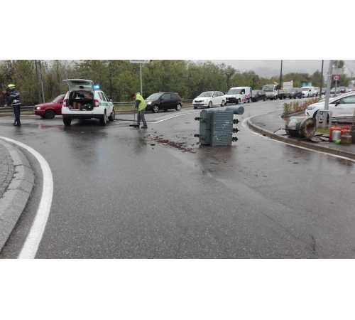 DOMODOSSOLA - 31-10-2018 - Traffico rallentato alla rotonda d'ingresso di Domodossola (tra Domo e Crevola) per una perdita di carico da parte di un mezzo pesante. Oggetti metallici assieme a del materiale ferroso sono caduti sulla sede stradale, ingombrandola. Sul posto la polizia per accertare l'accaduto e regolare il traffico sino alla rimozione del carico.