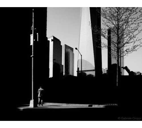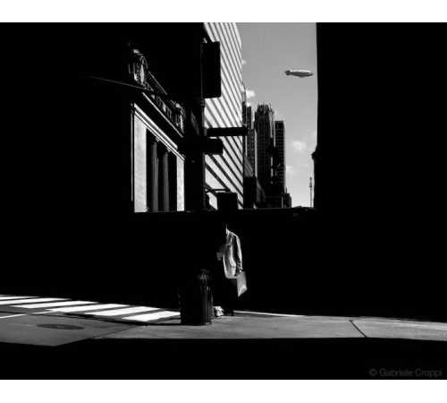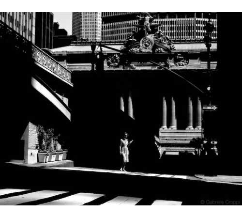 La singolarità del lavoro di Gabriele Croppi sta nel fatto che riesce a raggiungere una forma spoglia e fortemente evocativa calando figure solitarie in alcune delle zone più frequentate e caotiche della città. Croppi stesso sembra percepire la debolezza del mondo oggettivo e la risonanza interiore che i toni scuri e il vuoto sono in grado di raggiungere. Il colore nero, piuttosto dominante in questa serie dedicata a New York City, lungi dall’essere un mero elemento stilistico, agisce come un processo drammatico che risponde alla dichiarazione di Michaux.