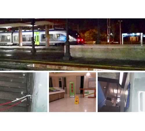 DOMODOSSOLA- 07-11-2018- Il maltempo ha creato problemi anche alla stazione internazionale di Domo rimasta al buio da ieri sera per un blackout. In molte parte le gocce d'acqua sono scese dentro lo stabile. I sottopassaggi per i binari 4 e 6 hanno infiltrazioni ed un binario è fuori uso da un lato.