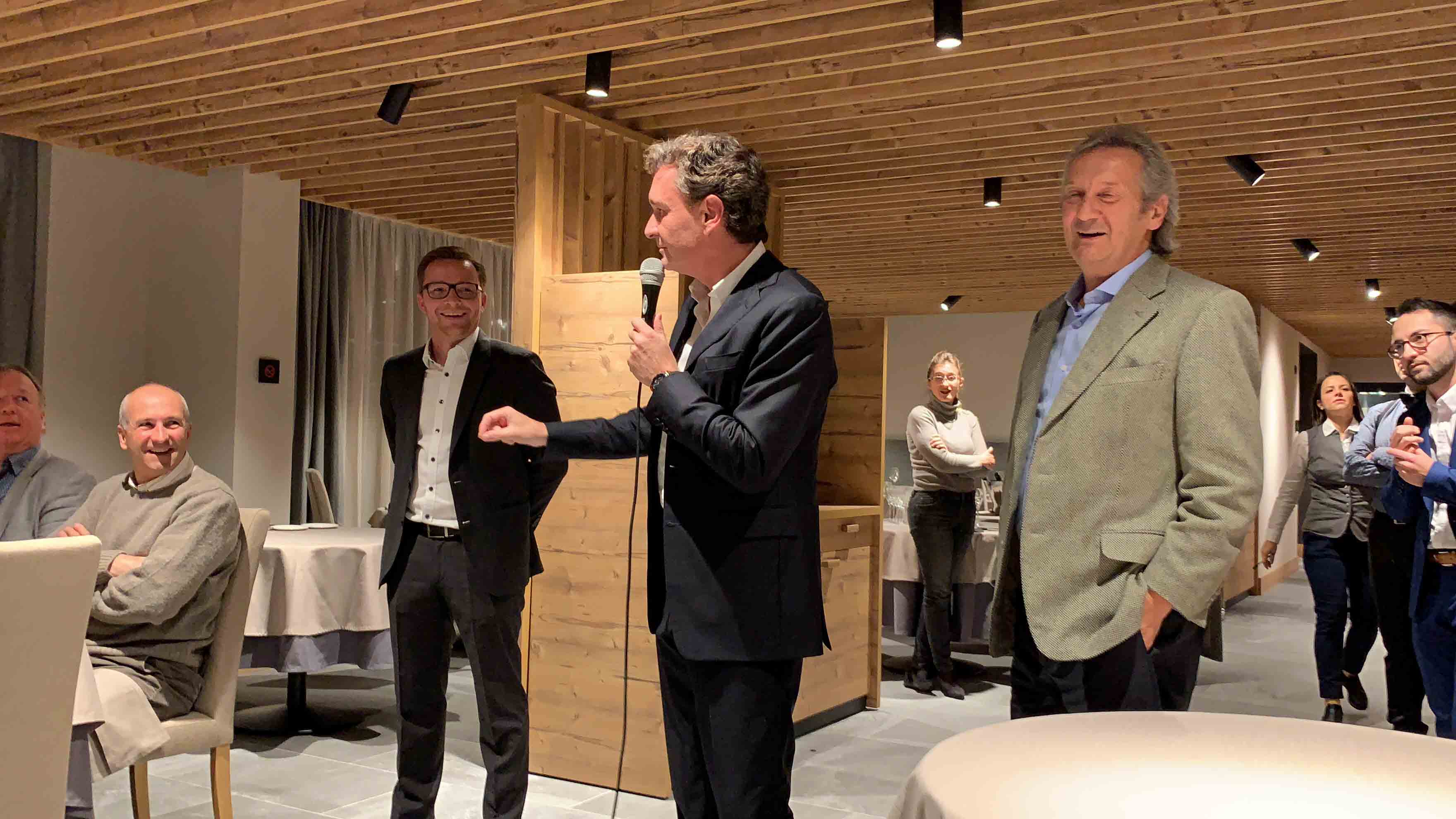 SAN DOMENICO-23-12-2018- Serata vip, la scorsa settimana, all'hotel la Vetta, il gioiello a quattro stelle da 77 camere della Mira Hotels & Resorts appena inaugurato a San Domenico, che ha ricevuto un importante riconoscimento direttamente dalle mani del Barone Philippe Sereys de Rothschild, della pluricentenaria famiglia di banchieri, rinomato produttore di champagne, che ha voluto concedere alla famiglia Malagoni ed alla loro nuova struttura la targa di “ambasciatori” del suo prestigioso vino, primi al mondo a riceverla. La targa è stata consegnata alla presenza di Alessandro Francoli, presidente delle omonime Distillerie famose in tutta Italia, che distribuirà lo champagne Rothschild nel Bel Paese, e di Daniela Righi, amministratore delegato degli Hotels Mira davanti ai giornalisti delle principali testate italiane di turismo ed a vari tour operator. Per tutti poi una cena stellata abbinata ai tre tipi di Champagne della maison Rothschild. Il Barone ha soggiornato una notte a San Domenico, prima di partire in elicottero ha ringraziato il personale della struttura per la professionalità e l'ospitalità. Per il turismo ossolano si intravede una possibilità di sviluppo, e di qualità, fino a qualche anno fa davvero impensabile.