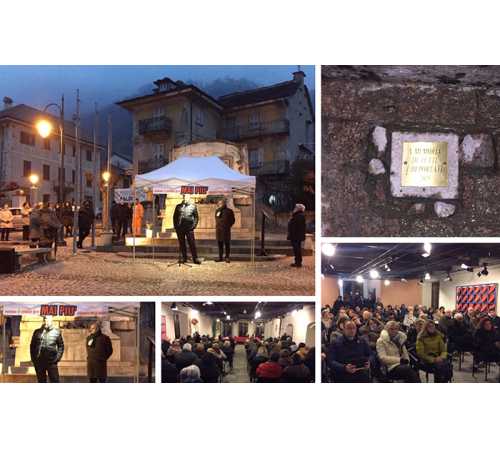 VOGOGNA- 27-01-2019- Alla presenza dell'On. Enrico Borghi, sindaco di Vogogna, e del collega deputato Pd, On. Emanuele Fiano è stata posata nella Piazza Pratini di Vogogna, ai piedi del monumento dei caduti, una pietra d'inciampo che reca la scritta a "memoria di tutti i deportati". Il deputato Fiano è intervenuto, tenendo una lezione dal titolo "Gli Ebrei e il mondo: perché il dialogo è difficile?" raccontando delle sue radici famigliari ebraiche: il padre di origine fiorentina è stato licenziato dal pubblico impiego, deportarto nel campo di Birkenau e infine liberato al termine della Guerra. Il comune di Vogogna ha organizzato in occasione del 27 gennaio, Giornata della Memoria, la lettura di tratti del libro di Primo Levi "Se questo è un uomo".