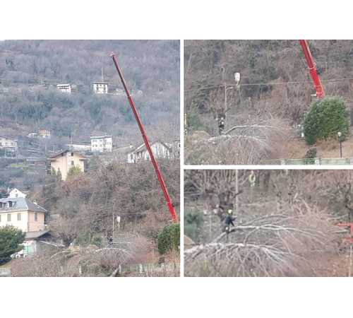 alla Noga per rimuovere le piante cadute lo scorso ottobre dopo la tromba d'aria che aveva devastato il cimitero della frazione ed in paese aveva causato alcuni danni, tra cui quello al tetto della scuola media. Nella scorse settimane era già stato fatto un intervento con un elicottero, ora è arrivata una grossa gru.