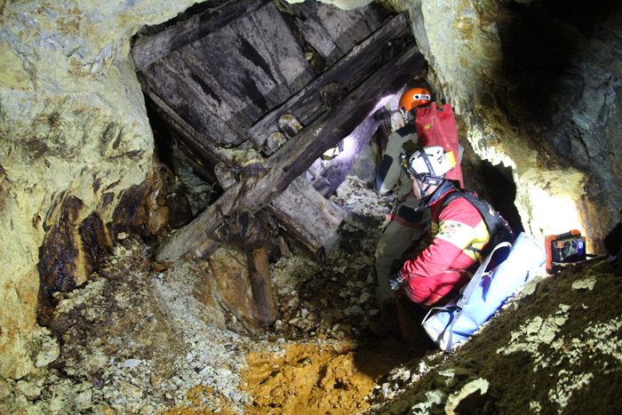 Osservando ogni singolo centimetro di montagna, in cerca di indizi e tracce che ci indicassero la via, siamo infine arrivati ad un rudere appena riconoscibile, che celava l'ingresso in buona parte franato della miniera.