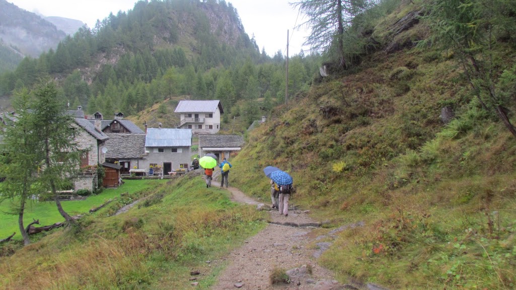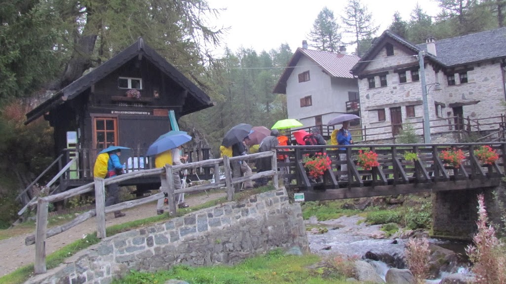 Circa due settimane fa ero passato da questi luoghi paradisiaci con una cara amica che voleva condividere con me dei bellissimi ricordi, anche se molto tristi. Ci torno oggi con gli amici consueti. Siamo tredici, fra cui due signore e tre esordienti, in una giornata inizialmente piovosa, che più tardi ci riserverà tante nuvole e qualche sprazzo di sole. Torna in gruppo anche Asia. Nonostante il giorno infrasettimanale di fine settembre, a Devero, 1631, c’è gente e sembra che non serva “avvicinare le montagne”. Parcheggiamo all’aperto, oltrepassiamo il ponte e teniamo la destra. Altro ponte per tornare sulla sinistra orografica del torrente Devero ed inizia la morbida ascesa sul bellissimo sentiero nel bosco, con gli ombrelli aperti. Un tallone traditore mi condiziona anche oggi, ma il passo tranquillo mi permette di stare in gruppo. Dopo mezz’ora siamo a Corte d’Ardui, 1748.