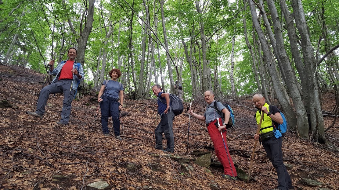Nuvole, sole, ma eviteremo la pioggia per tutto il giorno. Lungo il bel sentiero e un tratto della pista per Parpinasca raggiungiamo un bivio e saliamo a destra. Nel bosco puntiamo all’Alpe Drisioni, 1587, sulla dorsale a picco sull'Ossola. Si rientra nel bosco e, dopo una breve discesa, si risale fino all’Alpe Nava, 1728. Camminiamo da circa due ore. Il tempo ancora incerto ci induce ad evitare di raggiungere il bellissimo punto panoramico sulla piana ossolana che si raggiungerebbe alla nostra destra in circa dieci minuti. Ci dirigiamo a sinistra verso l’Alpe Rina sul sentiero pianeggiante e, dopo pochi minuti, imbocchiamo una traccia, sempre a sinistra, che diventa presto un evidente sentiero molto ripido e ci porta ad una selletta (Passo di Nava?). Teniamo la destra e in breve siamo sulla Punta I Pisoni, 1912 (30'). Certo che, tre anni fa, questo tratto ci era sembrato molto meno “in piedi”. Che si tratti del nostro invecchiamento? Il fango per le piogge dei giorni scorsi ha dato anche il suo nefasto contributo.