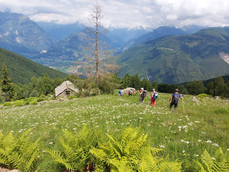 Pensando a cose più allegre ci godiamo il panorama bellissimo e cominciamo ad illuderci di evitare un po’ di pioggia. Torniamo alla selletta e scendiamo verso destra (nord), lungo quello che ci sembra e che si confermerà un evidente sentiero, fino all'Alpe Pieso, 1445. E’ ancora presto e continuiamo la discesa, fra prati e un tratto di bosco, fino a Parpinasca, 1210. Qui il rifugio è aperto ed apprezziamo subito il coraggio di chi reagisce alla situazione d’emergenza sanitaria ed economica riprendendo subito a lavorare, sia pure con tutte le precauzioni del caso ed in una situazione difficile. Fanno così i professionisti della montagna e meritano successo. Partiamo con un aperitivo, ma sentiamo parlare di polenta ed altre prelibatezze ad un tavolo vicino e, quindi, ci lanciamo in un ottimo pranzo.
