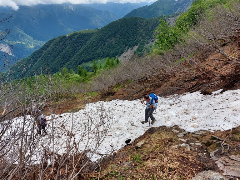 PREMESSA. La Punta I Pisoni, illustre sconosciuta, si trova lungo la cresta che dall'Alpe Nava sale all'anticima del Tignolino, il Tignolino di Trontano. Eravamo stati qui nel novembre 2017 in condizioni diverse. A due passi dall’estate mancano sicuramente i colori autunnali, ma trionfano il verde e le fioriture. Abbiamo avuto conferma che l’escursione, grazie alla sua esposizione ed al percorso prevalentemente in ombra, si adatta anche ai periodi caldi. Il buon dislivello e lo sviluppo ridotto fanno capire come si cammini quasi sempre “in presa diretta”, con le ginocchia all’altezza di molari e premolari nel sia pur breve tratto finale.