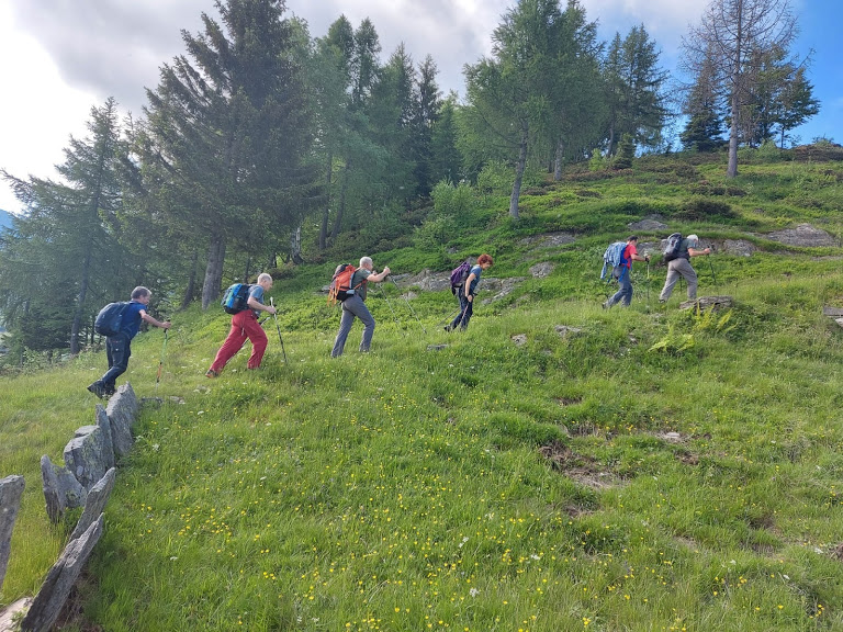 Una forte signora, colonna del gruppo, sopporta pazientemente un giovane lombardo e cinque anziani, due dei quali un po’ incattiviti dall’età (e lo dice un esperto). I nostri amici lacustri cominciano a spingersi verso nord con la giusta gradualità. Lo staff medico – sanitario controlla anche oggi il rispetto di tutte le regole dettate dalla prudenza in questa subdola pandemia. Il ritrovo è a Trontano. Dopo la piazza, alla rotonda, si sale a destra lungo la strada/pista per l’Alpe Parpinasca. Rispetto a quasi tre anni fa la strada è stata sistemata e si sale in auto senza grossi problemi. Inoltre, molto saggiamente, la sbarra non è chiusa e possono farne uso anche i contribuenti di serie B che ne hanno, appunto, contribuito non poco alla costruzione. Ciò permette di parcheggiare a quota 950, all’Alpe Faievo, risparmiando un’ora di cammino.