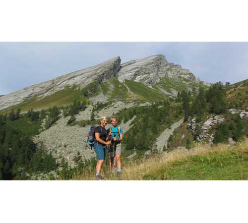 Torniamo sulla terra e, dopo un’altra lunga sosta di un minuto, il nostro coordinatore tecnico, che morde il freno fin dalla partenza, opera uno dei suoi proverbiali allunghi, senz’altro per studiare il tragitto mancante e metterlo in sicurezza. Cerco di stargli dietro, inutilmente. L’unico risultato è che alle dieci in punto, alla faccia del tempo indicato sul cartello sotto l’alpe Borca, mi trovo, insieme agli altri escursonisti “normali”, praticamente in vetta. Mancano solo il passaggio “chiave” e gli ultimi tre minuti di sentiero. Si tratta di una traversata di pochi metri, esposta, ma senza alcun problema in caso di roccia asciutta. Giuseppino, però, conoscendo la mia prudenza, mi ha preceduto proprio per prepararmi un’imbracatura di sicurezza, costituita da un cordino con nodo scorsoio ad un’estremità e pietra di qualche chilo ben fissata all’estremità opposta: mi consiglia di fissarla al collo e lanciare nel vuoto la pietra in caso di attacchi terroristici. Solite foto e dopo pochi minuti siamo in vetta, anche senza l’imbracatura di Giuseppino, il solito burlone.