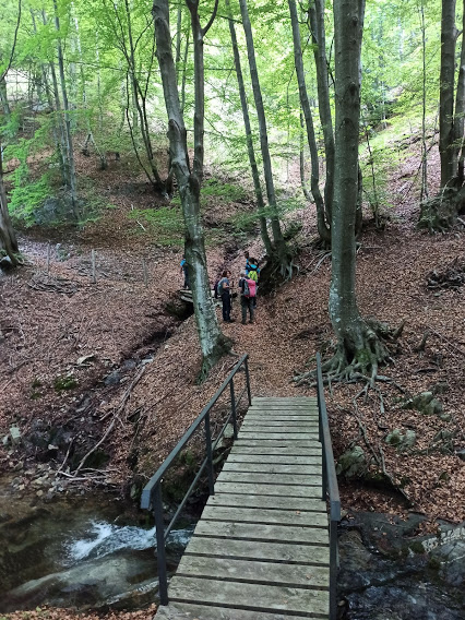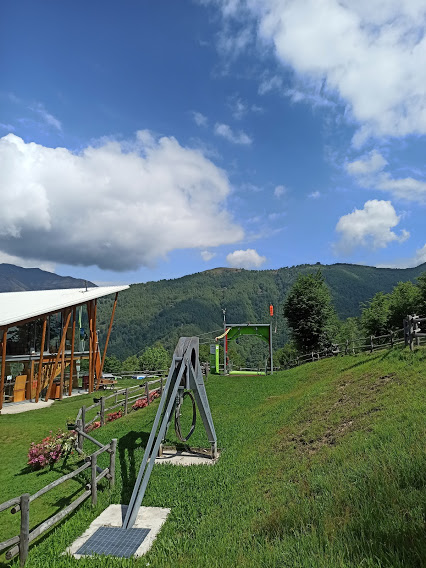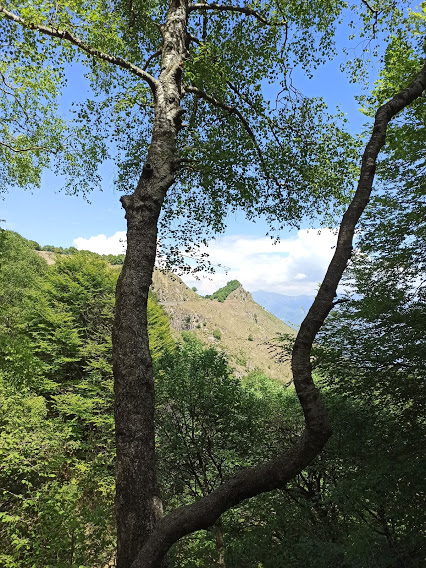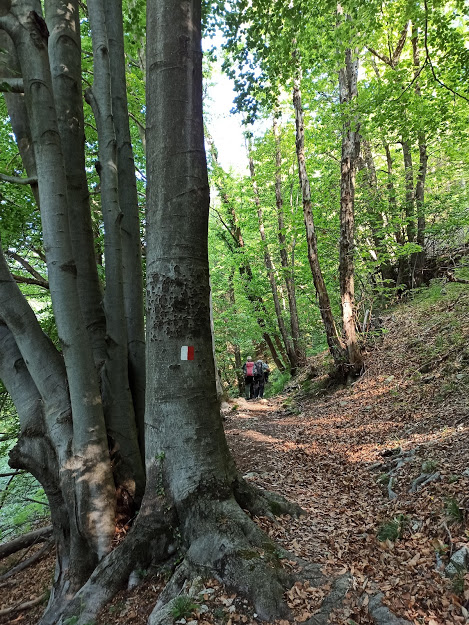 A Case Capelli lasciamo brevemente la strada per una scorciatoia che ci riporta più in alto sull’asfalto, dopo aver attraversato, per gentile concessione del proprietario, un cantiere edile privato. Un’altra brevissima scorciatoia prima di Gabbio e, passando da La Colma e da Corte Giovanoli, arriviamo alla stazione di valle della zipline che scende da Pian d’Arla qui all’Alpe Segletta, in realtà un paesino (circa mezz’ora). Siamo a quota 1000 e ci guardiamo intorno con calma. Un altro pezzo di strada lungo le case e, al primo tornante, imbocchiamo una sterrata pianeggiante, sempre verso nord est, che entra poco dopo in una bellissima faggeta. Il sentiero è indicato come R15a. Passiamo da località Comuni, 1047, e, poco oltre, scendiamo ad attraversare, su un comodo ponticello, il torrentello che scende da Piancavallo.