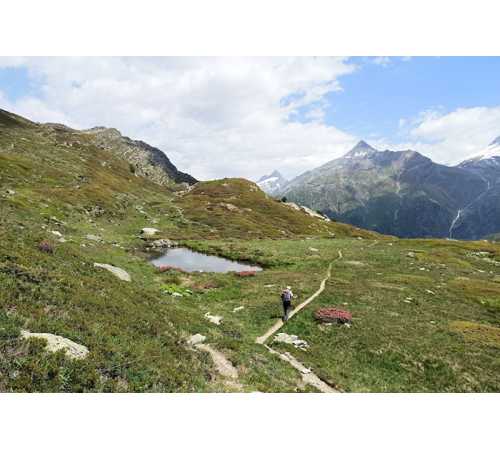 Torniamo rapidamente sui nostri passi fino ad un piccolo specchio d’acqua quasi asciutto, riparato dal vento, poco sopra il laghetto Undre Rossusee, costeggiato prima. Durante la pausa ci raggiungono anche due gocce portate dal vento, ma prevale il sole. Lungo l’evidente e battutissimo sentiero verso oriente torniamo al Passo del Sempione (due ore da Nanzlicke) e ci rituffiamo nella calura del fondovalle.