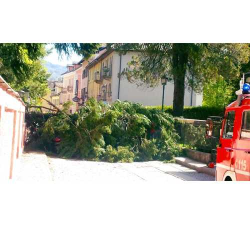 dove una grossa pianta è crollata per il forte vento rovinando sul muro di cinta di una delle ville di via Cavalli, area che sino a ieri era zona pedonale. Sotto i rami è rimasta una vettura che era posteggiata, salvata solo dal muretto di recinzione che ha bloccato la caduta del tronco. Fortunatamente nessuno passava in quel momento. Sul posto sono arrivati i vigili del fuoco.