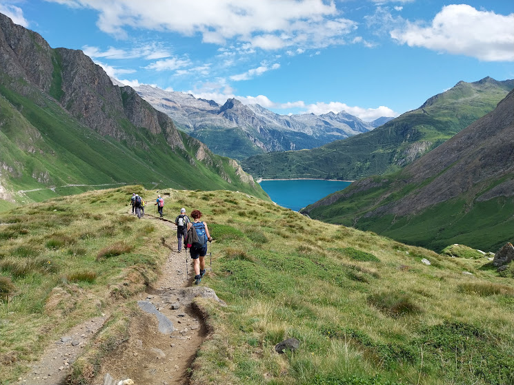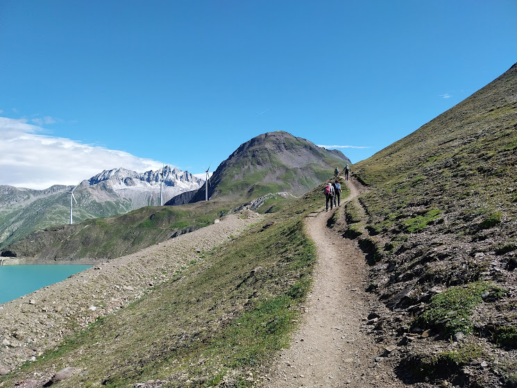 Oggi ci risparmieremo soltanto, rispetto al 2016,  la visita alle quattro grandi centrali eoliche in prossimità del Griessee ed il relativo dislivello in più. Parcheggiamo a pagamento sotto la diga di Morasco, 1743. Sole, nuvole, un po’ di vento e quattro gradi, ideali per camminare, soprattutto nel noioso tratto di strada che fiancheggia il Lago e ci porta alla partenza della funivia ENEL, 1850 circa.