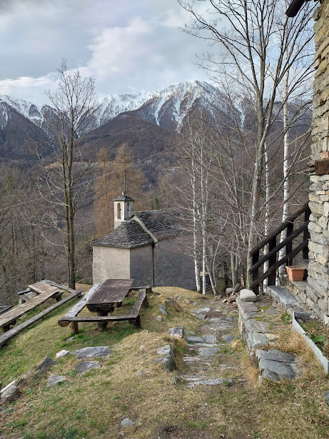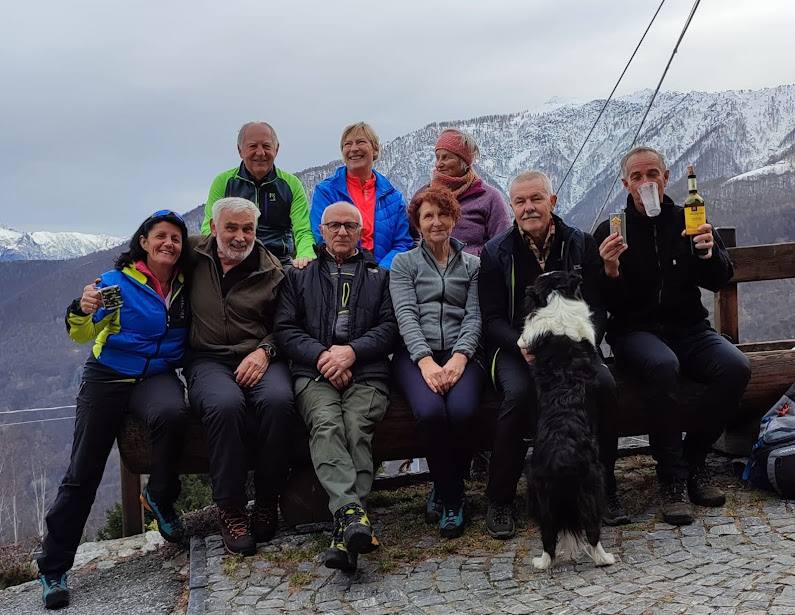 Nuvole e sprazzi di sole. Ci siamo accordati per un’escursione senza neve vagando su e giù per la bassa Val Bognanco. Oggi si rinforza ulteriormente la squadra delle badanti grazie ad un’esordiente. Quattro signore, quindi, si prendono amorevolmente cura, insieme al medico di turno, di quattro anziani. E c’è anche la piccola Asia, border collie. Troviamo fortunatamente due parcheggi appena prima del ponte sul Bogna in località Torno, 435. Passiamo sulla sinistra orografica e, lungo la provinciale, ci portiamo in località Gabbio, 465.