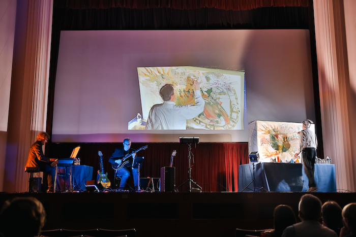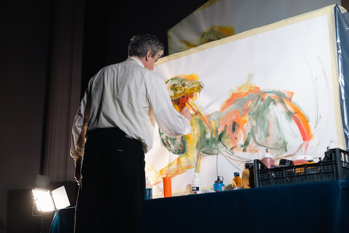 Ad accompagnare la performance pittorica, la colonna sonora firmata da Our Duo, composto dai maestri Fabrizio Spadea e Roberto Olzer, che hanno costruito un percorso musicale in tre atti: dalle sonorità etniche alle Pop Songs con omaggi a Fabio Concato, Dire Straits e Niccolò Fabi, fino a un toccante tributo a Pat Metheny, chiudendo con le emozionanti note di “Cinema Paradiso” di Ennio Morricone, eseguite chitarra e pianoforte.