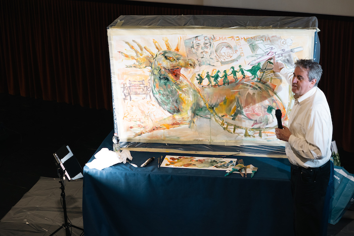 Protagonista della serata è stato l’artista Michele Scaciga, che ha realizzato dal vivo la tela destinata a ispirare la locandina ufficiale dell’edizione 2025 del celebre festival internazionale di cortometraggi. L’opera, intitolata “Cinema ad memoriam”, è un omaggio sentito alla settima arte e alla stessa Malesco, cuore del festival, rappresentata dal basilisco, simbolo del paese, attorno al quale si snodano citazioni visive che spaziano da Wim Wenders a Ingmar Bergman, passando per Orson Welles, la Nouvelle Vague e l’universo di Star Wars – la cui prima visione, racconta l’artista, avvenne proprio nel Cinema Corso nel 1977.