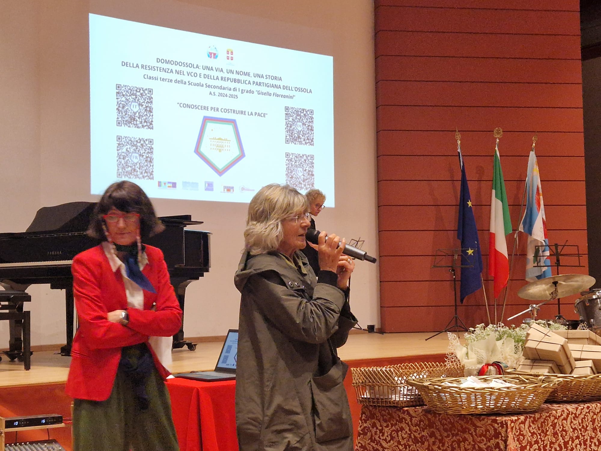 DOMODOSSOLA - 4-6-2025 -- Questa mattina nell’aula magna della scuola media Gisella Floreanini di Domodossola – nell'ambito delle celebrazioni dell'80° anniversario della Repubblica Partigiana dell'Ossola, si è svolta la presentazione del progetto “Una via, un nome, una storia della Resistenza del VCO e della Repubblica Partigiana dell'Ossola”. L’importante iniziativa coordinata dalla prof.ssa Flora Valterio intende promuovere gli ideali della Resistenza con la valorizzazione delle vie domesi, dedicate ai protagonisti della lotta partigiana. Spiega Valterio: «160 alunni di terza media, guidati da una cinquantina di insegnanti hanno ideato un progetto che unisce varie discipline: storia, lingue straniere, arte, tecnologia e musica, ricostruendo le storie di alcuni dei protagonisti della Resistenza in Ossola, uomini e donne a cui sono intitolate trentadue vie della città». Il percorso urbano è interattivo, accessibile tramite QR code in targhette che saranno affisse durante l’estate accanto ai cartelli stradali delle vie analizzate: chiunque potrà ascoltare attraverso la voce dei ragazzi, nelle varie lingue (italiano, tedesco, inglese e francese) 128 audio di testi autobiografici che raccontano la vita di questi uomini e donne della Resistenza. Le musiche provengono in parte dal repertorio dell’Associazione Cantar Storie mentre altre sono state arrangiate e suonate dagli alunni dell’indirizzo musicale delle Floreanini. L’iniziativa è finanziata dal Comune di Domodossola per la stampa e l’affissione delle targhette e dalla Pro Loco per le cartoline pubblicitarie, con la collaborazione della Casa della Resistenza di Fondotoce, l’Istituto Storico della Resistenza “Piero Fornara” di Novara, il Museo partigiano Raggruppamento Divisioni patrioti “Alfredo di Dio” di Ornavasso-Busto Arsizio, l’ANPI provinciale, e l’Associazione Cantar Storie. Il sindaco Lucio Pizzi e la preside Chiara Varesi hanno inaugurato una delle targhette, ed è stato lanciato anche il sito web che raccoglie i testi.