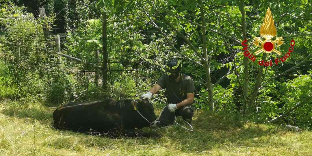 CALASCA CASTIGLIONE - 13-6-2025 -- Intervento delicato nella mattinata di venerdì 13 giugno per i Vigili del Fuoco del Verbano-Cusio-Ossola, impegnati nel recupero di un giovane bovino ferito nel Comune di Calasca Castiglione. L’animale, che si trovava al pascolo in località Gaggio, è caduto accidentalmente mentre rincorreva un altro capo, procurandosi la frattura di un arto.