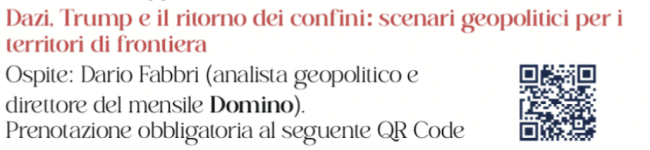 Il tema è di stretta attualità: quali possono essere le conseguenze, per l’economia di un territorio di confine come il nostro, dei nuovi dazi introdotti dal presidente Usa Donald Trump? Fabbri offrirà al pubblico le risposte a questa e a molte altre domande, analizzando la situazione da un punto di vista geopolitico. La partecipazione all’incontro è gratuita. È però obbligatoria la prenotazione, da effettuare inquadrando il Qr code qui sotto.