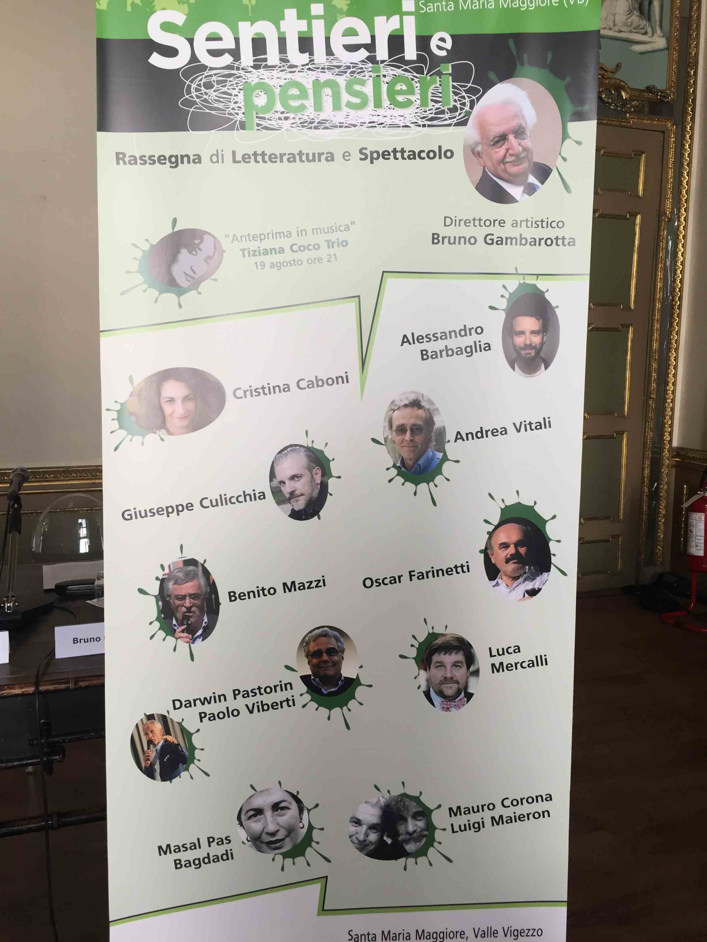 Venerdì 25 agosto: l'alpinista e scrittore Mauro Corona e il musicista Luigi Maieron presentano il loro ultimo libro “Quasi niente” Ed. Chiarelettere in un incontro tra musica, ricordi e suggestioni (ore 18); a seguire il finale di Sentieri e Pensieri, serata a cura del CAI Valle Vigezzo, con il meteorologo Luca Mercalli in dialogo con Raffaele Marini - “Micro e Macro: dai microclimi del Lago Maggiore e della Val Grande al clima del pianeta" (ore 20.45 Teatro Comunale).