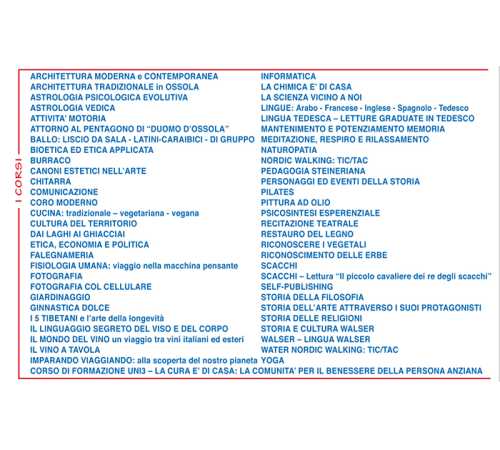 DOMODOSSOLA- 08-09-2017- Appuntamento martedì 19 settembre a teatro Galletti alle ore 17 per la presentazione fatta dai docenti dei corsi proposti per la nuova stagione dell'Università della terza età domese. Tantissimi i corsi offerti, una sessantina, che spaziano dal “ballo liscio” al “vino a tavola”, ma anche dall' “etica, economia e politica” alla “storia della filosofia”. L'inizio delle lezioni sarà il 23 ottobre, il termine il 17 maggio. Le iscrizioni si raccolgono dal 19 settembre al 13 ottobre, ed i moduli con le tariffe sono disponibili presso gli uffici dell'Azienda farmacia Comunale.