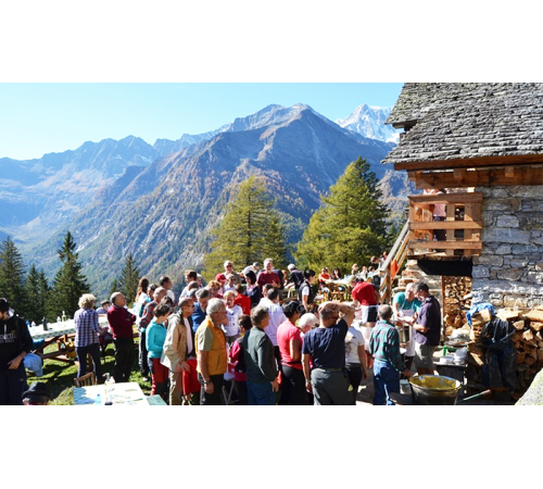 VALLE ANZASCA- 17-10-2017- Festa sabato l'alpe Cicerwald, con messa e pranzo: “Non poteva esserci giornata migliore- spiegano i partecipanti- per chiudere le feste estate ed iniziare l'autunno nella valle del Rosa. Nella splendida balconata dell'alpe Cicerwald, con un panorama su tutta la val Quarazza, dal lago delle Fate al passo del Turlo, con la parete Est del Rosa con tutta la sua grandezza, si sono radunati un centinaio di persone per trascorrere una giornata in allegria. Dopo la cerimonia religiosa, celebrata da Don Maurizio, presso la Cappelletta all'ombra dei larici, tutti a tavola da Carlo, per un lauto pranzo con un ottima polenta del Nandi accompagnata da gustoso tapelucco, salsicce, spezzatino, formaggi, torte e castagne. Cicervald è un alpeggio raggiungibile partendo da Borca, dietro la Chiesa, salendo un ripido sentiero a solatio, che si inerpica tra i profumi dei pini e dei larici. E' ricordato per la prima volta nell'atto del 26 giugno 1208 con il nome di