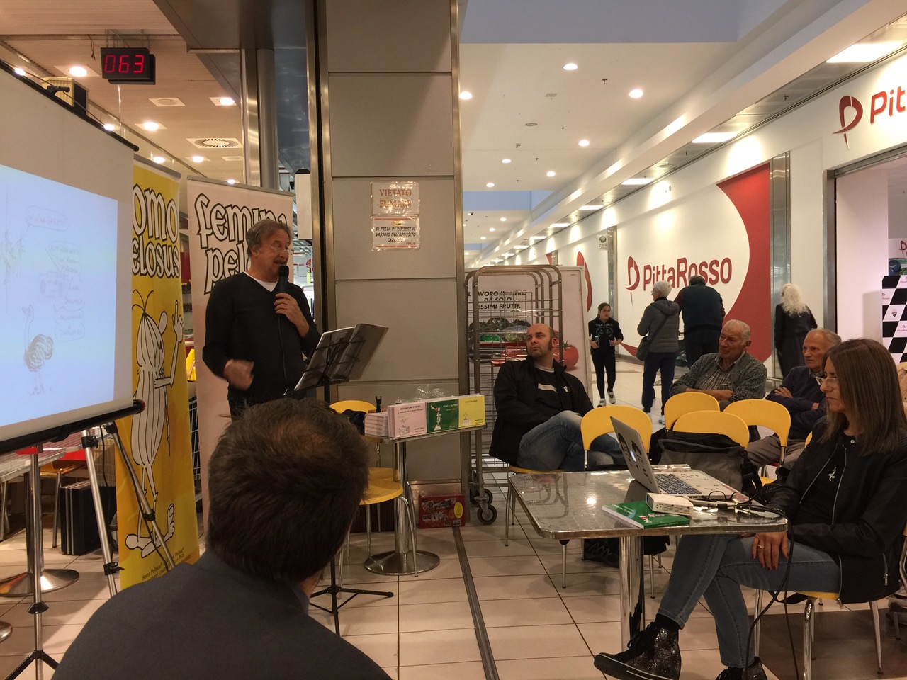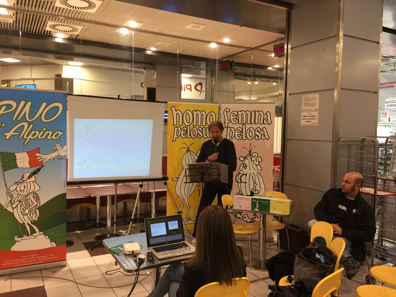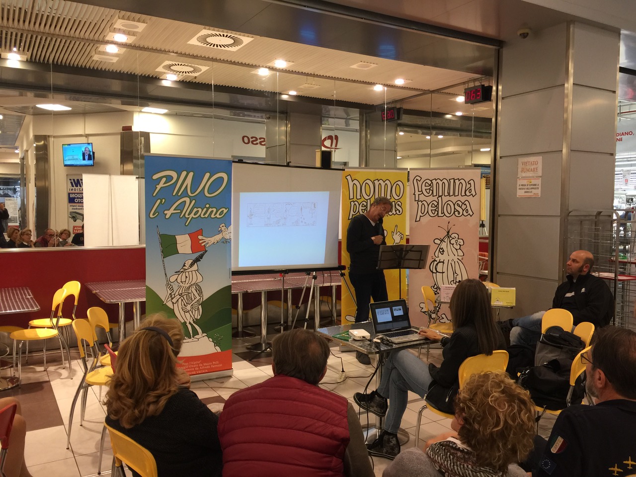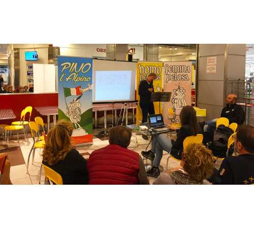 di Federica di Meo, famosa disegnatrice del manga “Somnia” edito da Panini Comics, tenuto presso il liceo artistico di Omegna e, con la presentazione del nuovo libro a fumetti “Pino l’alpino” di Mauro Polli, che si è svolto presso il coop caffè dell’Ipercoop di Crevoladossola, è iniziato il fine settimana dedicato all’evento denominato “Borsa scambio”: legato al collezionismo ed all’antiquariato minore. L’iniziativa è organizzata dall’Associazione “La nuova idea” in collaborazione con l’associazione Giovan Pietro Vanni, con il presidio soci coop Ossola ed il centro commerciale “Ossola Shopping Center”. Oltre 200 metri lineari di banchetti con vinili, fumetti e tanto altro aspettano il numeroso pubblico di appassionati presso il centro culturale “La Fabbrica” di Villadossola. La simpatica anteprima di venerdì ha permesso al pubblico presente di conoscere la verve creativa di Mauro Polli che, coadiuvato dall’amico disegnatore Alfredo Fantozzi, nel 2013 ha recuperato dai “cassetti” il personaggio preistorico a fumetti nato sui banchi del liceo “nelle lunghe e noiose ore di latino”, con gli amici Massimo Stringara e Claudio Rossi: l’Homo Pelosus. La saga dei “pelosi” è continuata nel 2016, con l’arrivo della “femmina pelosa” la compagna del personaggio principale e le loro avventure. “Pino l’alpino”, ultimo (per ora) libro della collana, stupisce ancora una volta gli appassionati di questo fumetto, perché è l’ideale collegamento tra il primo fumetto che ha visto protagonista un alpino, precisamente “l’alpino Giuseppe” pubblicato sul mensile sezionale degli alpini di Domodossola: “La Vetta”, quarant’anni fa. Il personaggio era nato dalla fantasia dell’allora presidente di sezione dell’Anadi Domodossola, il Tenente Gianfranco Polli, padre di Mauro. Nel libro “Pino l’alpino” sono raccolte le strisce uscite su “La Vetta” e le nuove avventure del personaggio preistorico “peloso”. Inoltre sono rappresentati anche un gran numero di aforismi, tutti rigorosamente ambientati nel territorio ossolano.