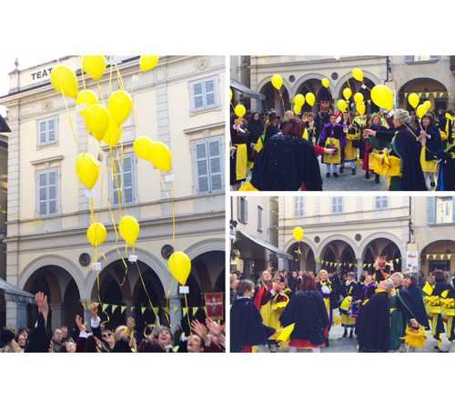 in piazza Mercato, e tra due ali di folla le componenti del Gruppo Folk domese hanno lasciato salire in cielo i palloncini gialli con attaccato il biglietto plastificato "Gruppo Folk Città di Domodossola": "Vedremo dove arriveranno- spiegano- se qualcuno ci segnalerà di averli ritrovati. Già in passato avevamo fatto una iniziativa simile e ci avevano contatto anche da molto lontano".