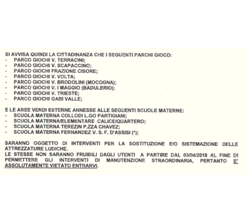 DOMODOSSOLA- 27-03-2018- Chiuderanno dal prossimo 3 aprile per interventi di manutenzione straordinaria i parchi giochi e le aree verdi domesi.