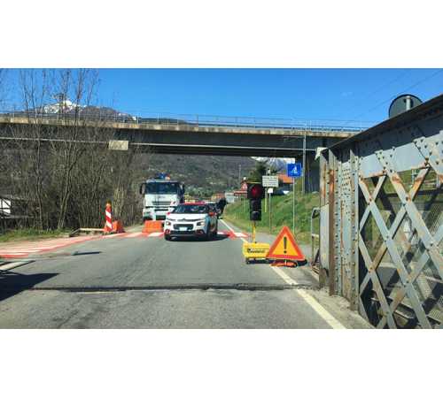 DOMODOSSOLA -17-04-2018- Senso unico cadenzato da un semaforo per la realizzazione dei nuovi marciapiedi in via Mizzoccola, dalla sede dell’Anfass fino al ponte sulla Toce. L’intervento è stato deciso dall’amministrazione comunale domese per migliorare il percorso pedonale su questa arteria.