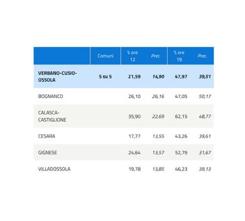 la percentuale dei votanti alle ore 19 nei cinque comuni del Vco che devono eleggere sindaco e consiglio comunale. La percentuale più alta a Calasca Castiglione, col 62,15%. A Villadossola la percentuale alle 19 era del 26,23%. I seggi chiudono alle ore 23, dopo inizierà subito lo spoglio dei voti.