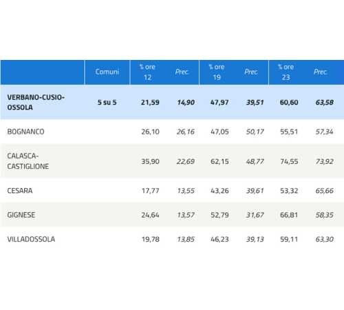 VCO- 10-06-2018- E' stata del 60,60% l'affluenza media dei votanti nei cinque comuni del Vco interessati al rinnovo di sindaco e consiglio comunale. Il record l'ha fatto registrare Calasca Castiglione con il 74,55% dei votanti. Villadossola, il centro più grande al voto in questa tornata elettorale, si attesta sul 59,11%.