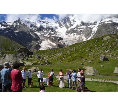 lo sposo in panciotto grigio e attorno a loro, gli amici e i parenti giunti a condividere e festeggiare la giornata speciale. A fare da cornice, testimone silenziosa, la maestosa parete Est del Monte Rosa. Chiara di Verbania e Alessandro di Milano, si sono sposati ieri, 4 luglio 2018, nel prato fiorito dell'alpe Pedriola. Conoscete uno scenario più bello? Auguri a loro !