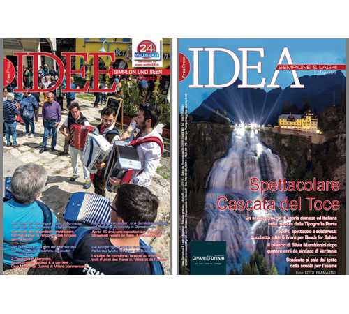del numero di luglio del nostro magazine free press trilingue IDEA / IDEE. Le due foto delle due copertine sono entrambe di Luigi Framarini, una è dedicata alla Cascata del Toce, ed alle sue aperture estive, l'altra al raduno delle fisarominche in occasione del convegno dei popoli di lingua walser.