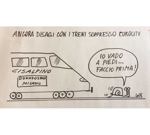 DOMODOSSOLA- 06-07-2018- I disagi di questi giorni sui treni della linea per Milano nella nuova vignetta di Carlo Lux, architetto di professione, ma con la passione per il disegno, come dimostra in questa vignetta...