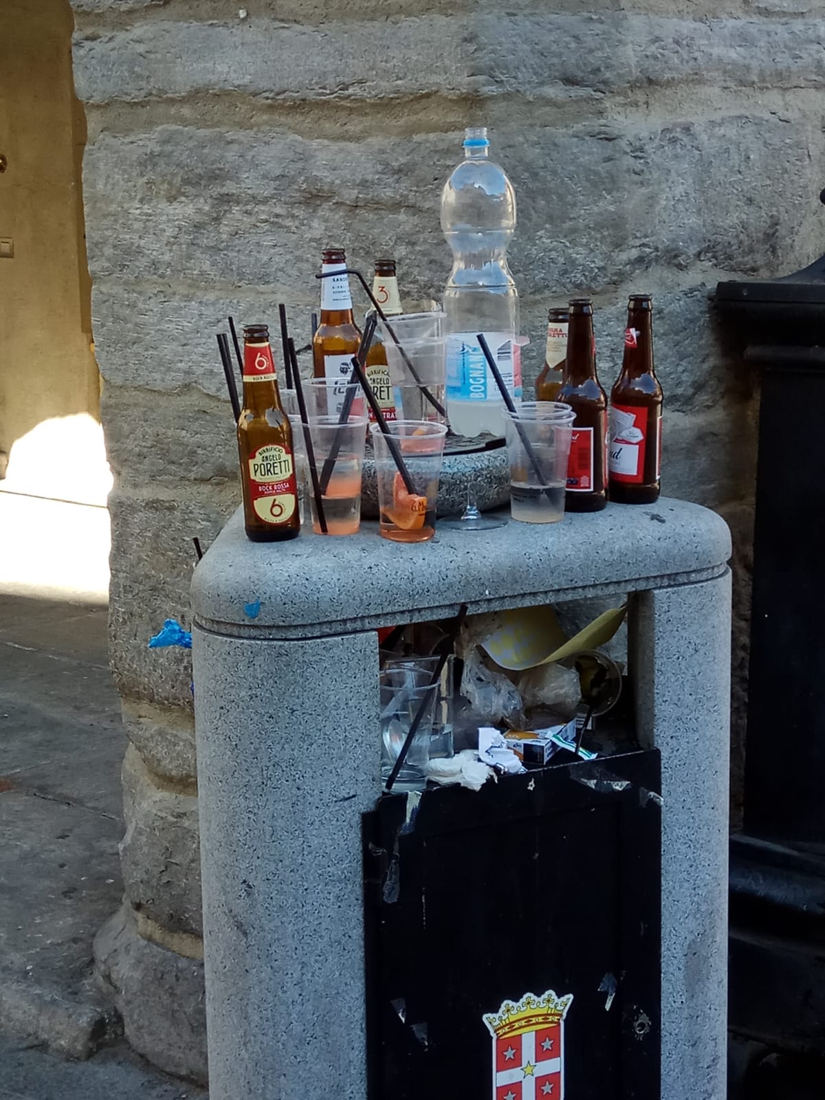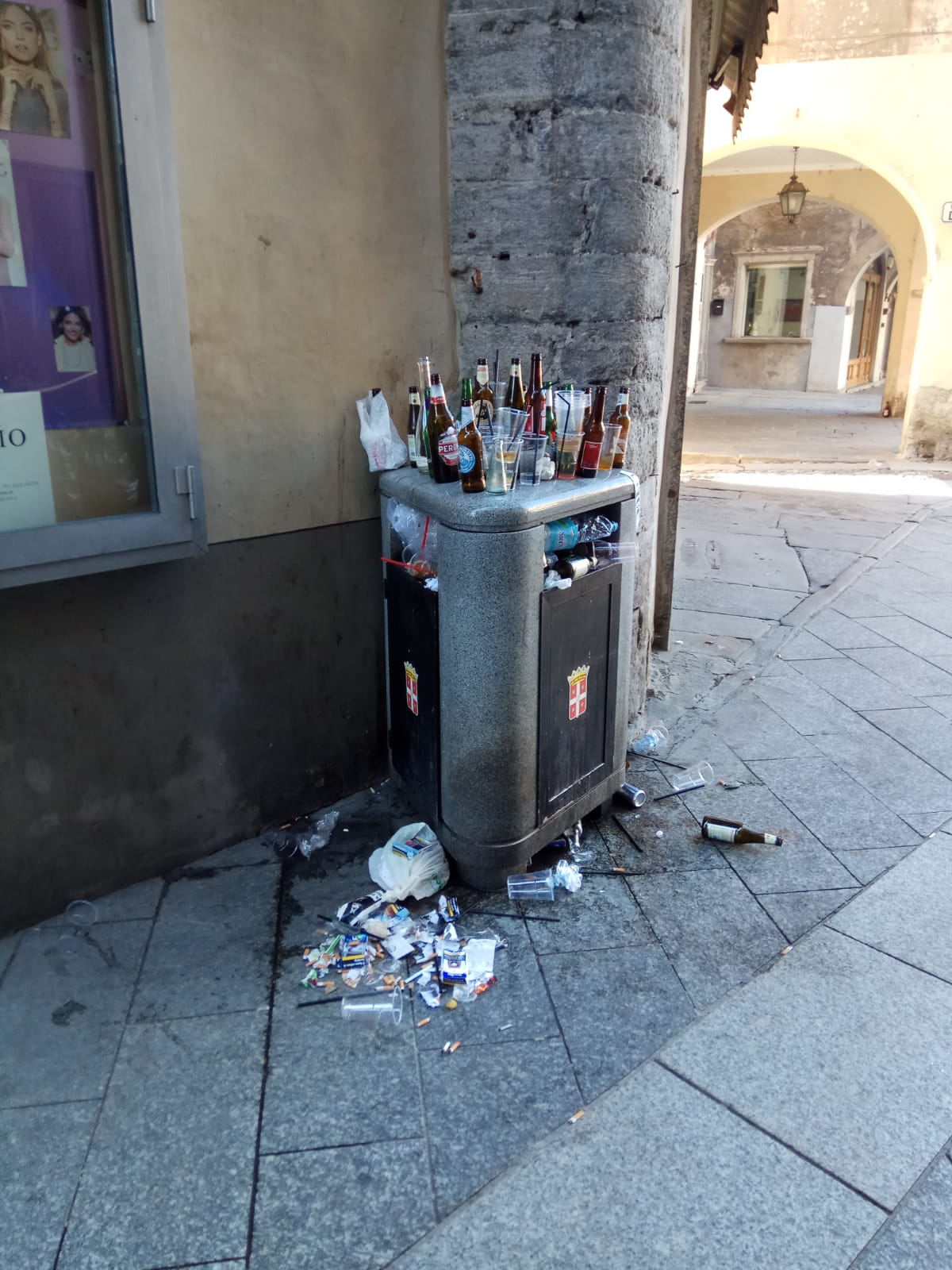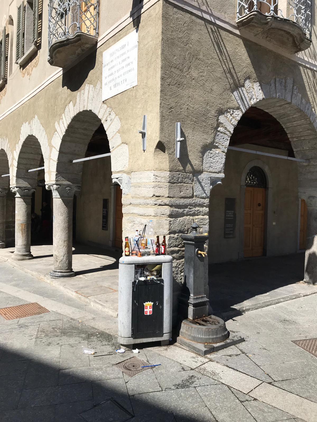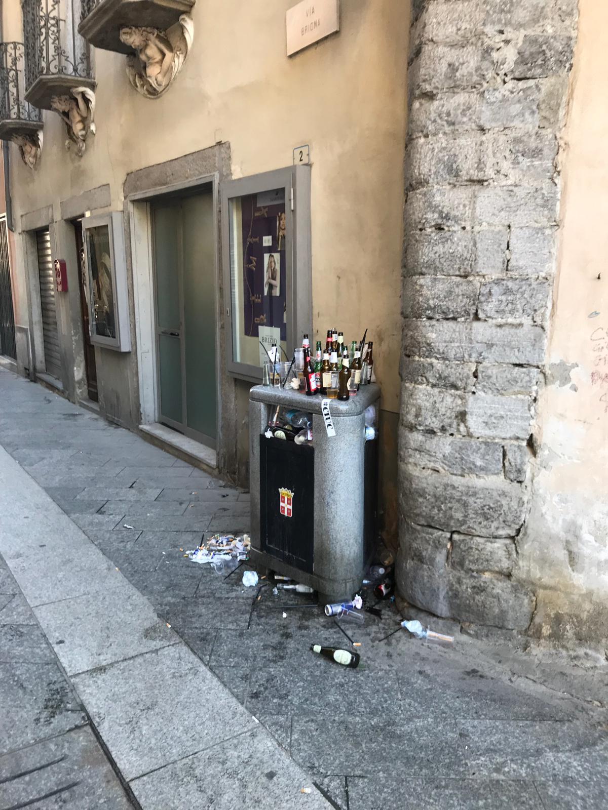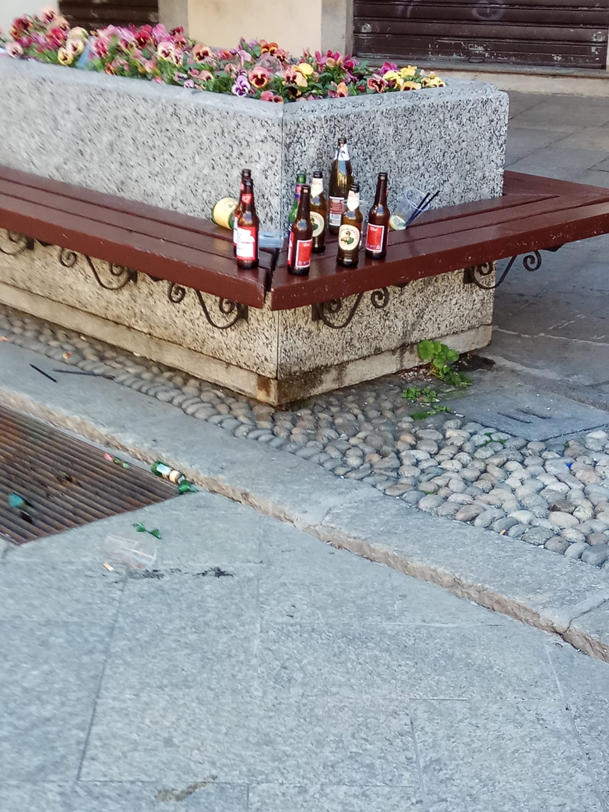 DOMODOSSOLA- 01-05-2019- Indecente lo spettacolo che si presentava stamane in piazza Mercato, con i cassonetti stracolmi di bottiglie vuote, disseminate un poì in tutti gli angoli, ed anche con vetri rotti. Probabilmente nel giorno festivo in cui si onorano i lavoratori non è stato fatto il servizio di pulizia. Da rimarcare la grande "sete" dei frequentatori della movida rispetto alla capienza ed al numero dei cestini, tutto sommato la maggioranza delle bottiglie era comunque posizionata nei pressi degli stracolmi cestini. Resta il fatto che lo spettacolo di stamane non è certo un bel biglietto da visita per una città che deve vivere di turismo...