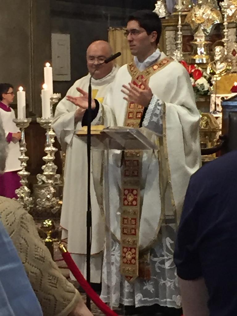 DOMODOSSOLA - 23-06-2019 - Don Alessandro Ghidoni è tornato a Domodossola. Il giovane sacerdote di Varallo, che è stato ordinato solo una settimana fa a Novara e che nel periodo del diaconato ha svolto servizio nella parrocchia domese, questa mattina ha celebrato in Collegiata la sua prima messa nella città che l'aveva accolto. Una messa particolare, con la celebrazione degli anniversari di matrimonio, in occasione della patronale. Visibile l'emozione sul volto del giovane sacerdote, ma anche nei tanti che hanno avuto modo di conoscerlo e apprezzarlo in questi mesi.