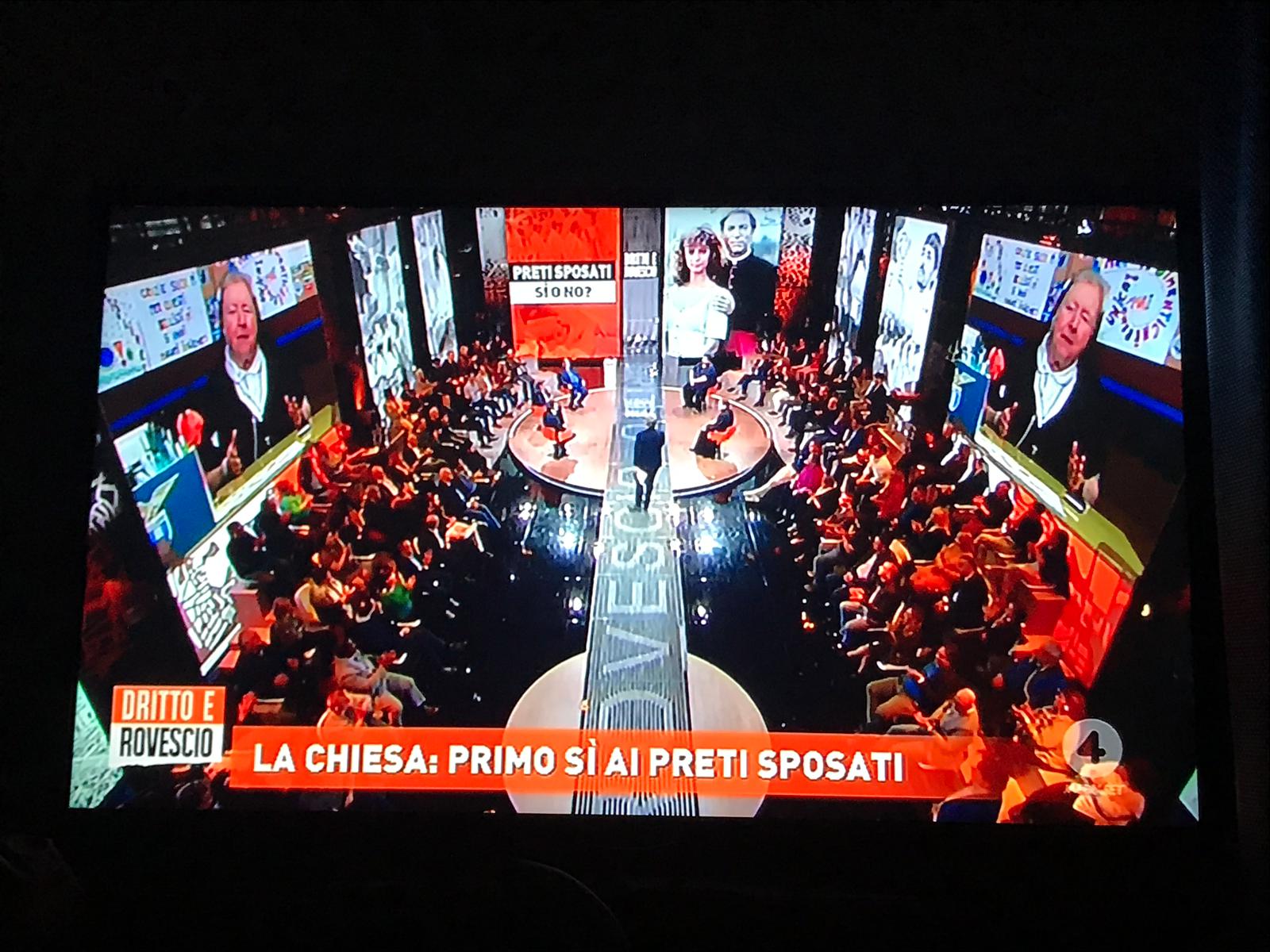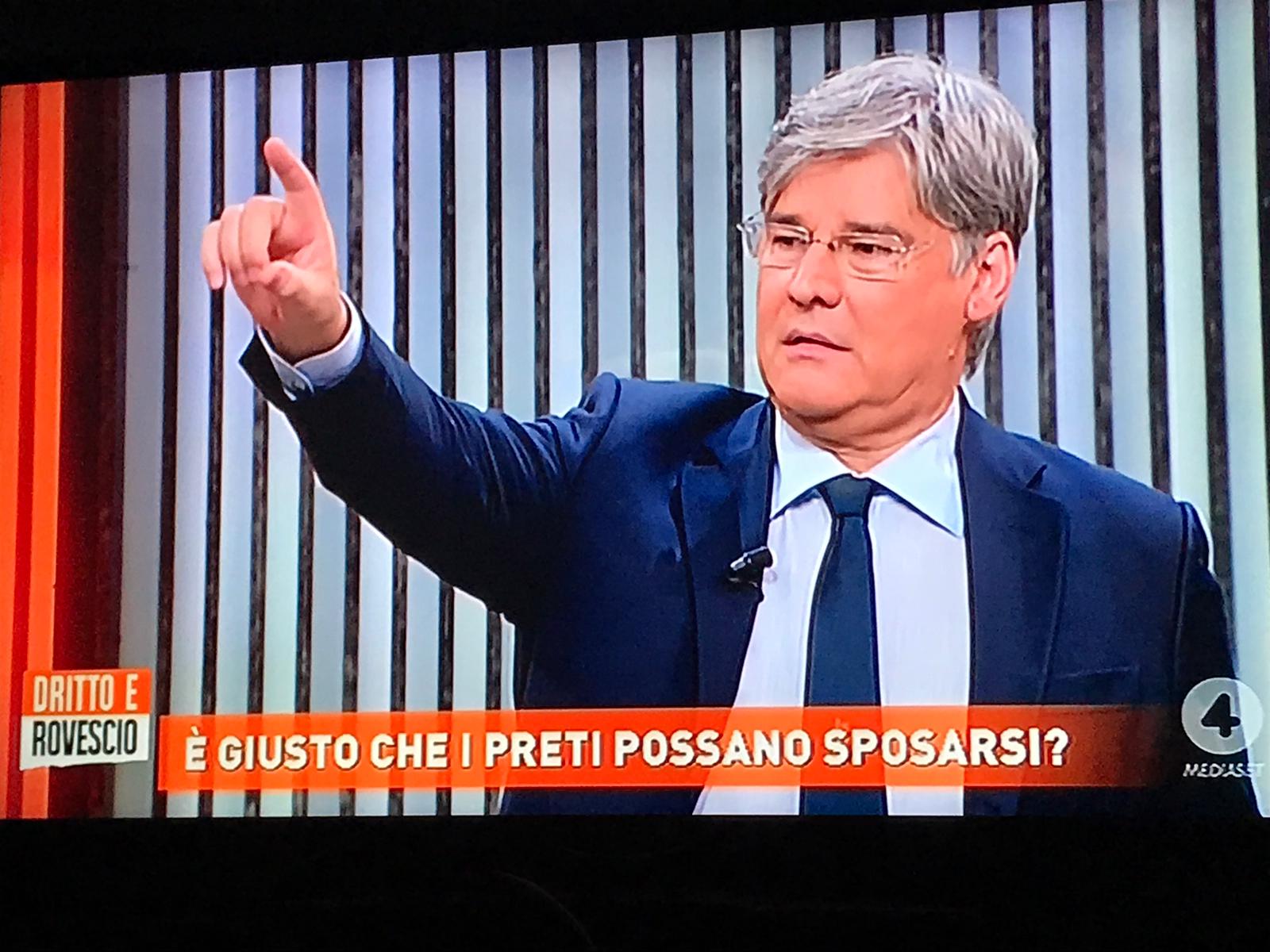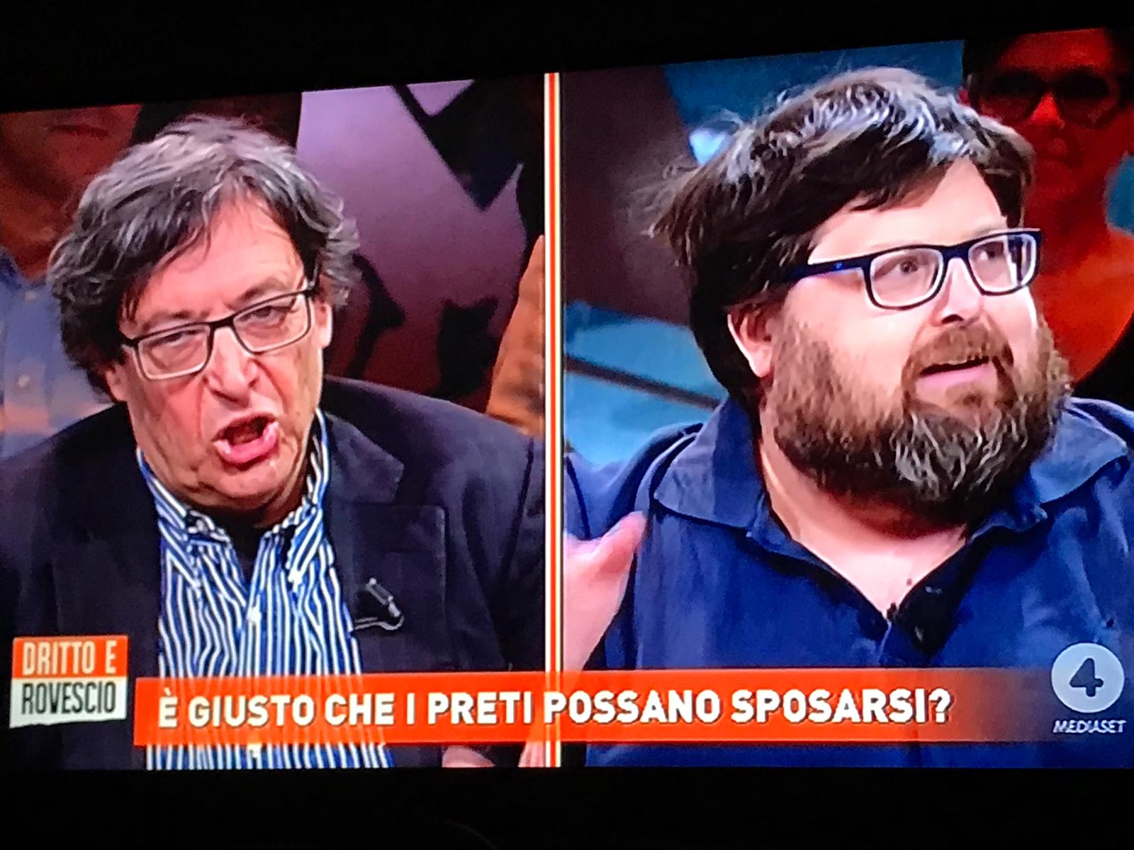 Giuseppe Serrone, sempre più una star della tv. Dopo averlo visto, il 16 ottobre, nel salotto di Barbara D'Urso a difendere le posizioni degli ex preti che hanno abbandonato la tonaca per convolare a nozze, l'insegnate di Domodossola è stato tra i protagonisti, ieri 31 ottobre, della trasmissione di approfondimento giornalistico di Retequattro, "Diritto e rovescio", condotta da Paolo Del Debbio. Dopo le caute aperture giunte dal Vaticano sul matrimonio dei sacerdoti, il tema è salito infatti agli onori della cronaca. Il confronto, come stile della trasmissione impone, s'è acceso diverse volte. In particolare nello scontro tra Serrone e il polemico fondatore de Il Popolo della Famiglia (PdF), Mario Adinolfi. Il primo ha accusato Adinolfi d'integralismo e questi, a sua volta, l'ha tacciato di ambiguità.