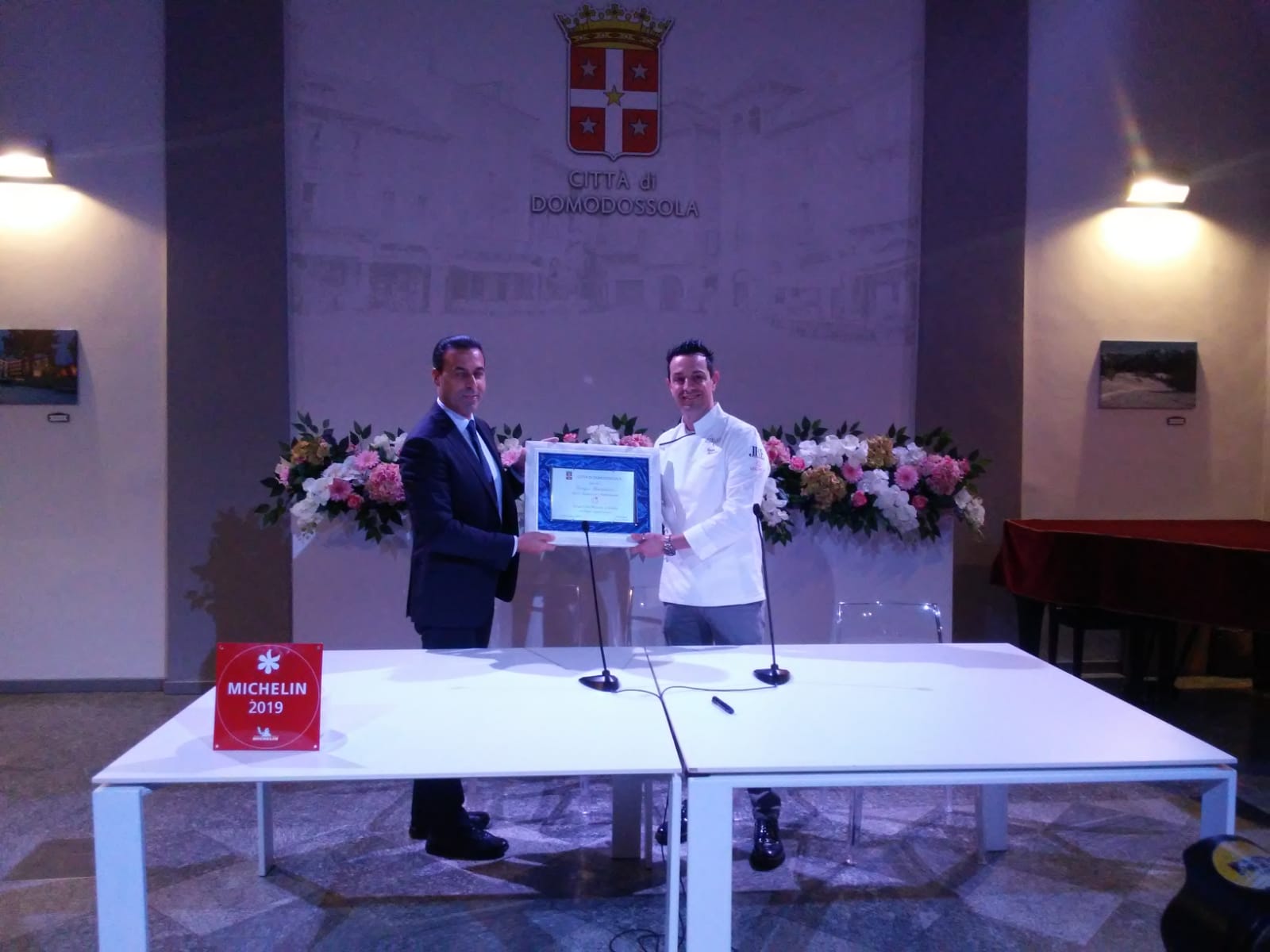 di Domodossola ha celebrato questa sera in Cappella Mellerio la prima stella Michelin ossolana: lo chef Giorgio Bartolucci, titolare del ristorante Atelier a Domodossola. "É il coronamento di un percorso importante a cui si arriva con impegno e professionalitá" ha detto il sindaco Lucio Pizzi che ha omaggiato Bartolucci con una speciale targa e una giacca da chef con il logo della cittá di Domodossola. "Ringrazio in particolare la mia famiglia che é alla base di quello che ho costruito e i miei collaboratori" ha detto lo chef stellato. La serata é proseguita con un ottimo buffet cocktail con le specialità firmate dallo chef stellato.