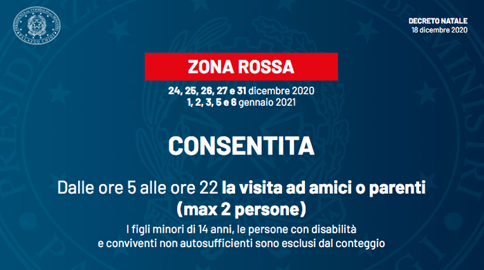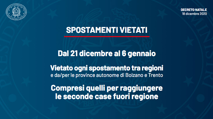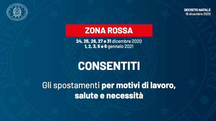 In particolare il 24, 25, 26, 27 e 31 dicembre 1, 2, 3, 5, 6 gennaio saranno giornate rosse per tutto il Paese, dove si potrà uscire di casa solo per ragioni di lavoro, necessità e salute.