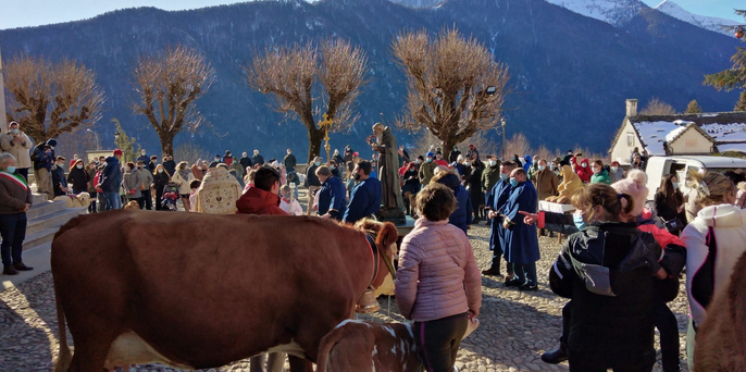 TOCENO- 17-01-2021--Anche in tempi pandemici Toceno festeggia il Santo Patrono, Sant'Antonio, protettore degli animali. Questa mattina, pur dovendo rinunciare alla tradizionale processione per le vie del paese, la comunità si é ritrovata in chiesa per la messa solenne e nell'antistante piazza per la benedizione degli animali.