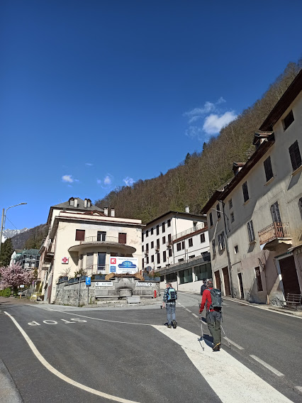 La mulattiera scende ancora per attraversare, sul ponte romanico, la profonda forra del rio e risale con stretti tornanti sul ripido versante occidentale del vallone. Arriviamo al bivio per l’Alpe Agrello, 785, ma teniamo la sinistra e scendiamo a Ca’ Monsignore, 724. La discesa prosegue e raggiungiamo il ponte sul Rio Rasiga, che una volta chiamavamo Rabianca. L’acqua qui scarseggia sempre, ma non è per la siccità. Risaliamo per poche decine di metri fino al bivio per Valpiana, ma teniamo ancora la sinistra ed iniziamo la discesa verso Bognanco Fonti, incrociando nell’ultimo tratto le rovine della strada che avrebbe dovuto raggiungere Valpiana nei primi anni duemila. Dopo un’ora e venti minuti dalla partenza siamo sulla strada all’ingresso del paese.