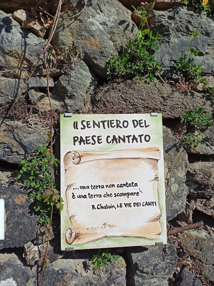 Incontriamo un amico che ha, più o meno, lo stesso programma escursionistico mio e di Asia e proseguiamo insieme. Passiamo a salutare il signor Mella nel suo negozio, dove è in allestimento una ricca enoteca. Provo una grande ammirazione per chi crede con determinazione e coraggio nel futuro della sua valle. Risparmiamo un po’ di asfalto passando, nei pressi della chiesa, lungo scalette, forse anche private, che ci riportano sulla strada in prossimità dell’albergo Croce Bianca, adesso pub pizzeria. Di qui parte il bellissimo Sentiero del Paese Cantato, pulito, ben tracciato, fiancheggiato di semplici opere d’arte in ferro e legno, di massime di saggezza popolare. Arriviamo alla frazione Boco, 890, dove incontriamo il Sentiero dei Proverbi e l’Ecomuseo della Val Bognanco. E’ stupendo: un misto di pulizia e ordine svizzeri con genialità e fantasia italiane, un insieme di piccole opere d’arte popolare, tanto sole, bel panorama, tranquillità e pace fuori dalle rotte troppo battute dai montanari della domenica (quelli del picnic a tre metri dall’auto e dei rifiuti lasciati lì). Rapidamente saliamo a Bacinasco, 950, e qui l’amico propone un aperitivo a San Lorenzo, pochi metri più sopra (un’ora scarsa da Bognanco).