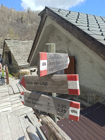 Ai bicchierini di Arneis viene proditoriamente abbinata una “merendina” nostrana. Un amico di passaggio contribuisce alla nostra reidratazione con il superbo bianco piemontese. Ed è così che il veloce aperitivo si prolunga per un’oretta e riprendiamo a salire per smaltire le calorie impreviste. La più contenta è Asia che si mangia il mio bel panino con mortadella di Bologna. Con percorso più o meno libero, di fianco alla strada, saliamo all’altezza del piazzale di Graniga, dove un bel sentiero prosegue sulla destra, parallelo alla strada per San Bernardo, ma più in basso. Incontriamo delle baite e qui ci sono dei cartelli segnaletici in legno che indicano direzione e tempi per raggiungere Devero, Crampiolo, Scatta Minoia, ecc…..